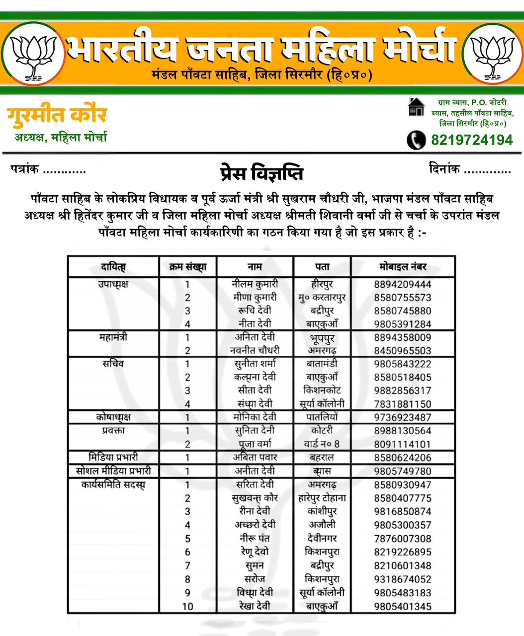 पांवटा साहिब – भाजपा महिला मोर्चा अध्यक्ष गुरमीत कौर ने पांवटा साहिब मंडल महिला मोर्चा की नई कार्यकारिणी की घोषणा कर दी गई है।